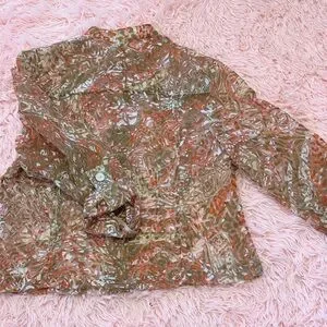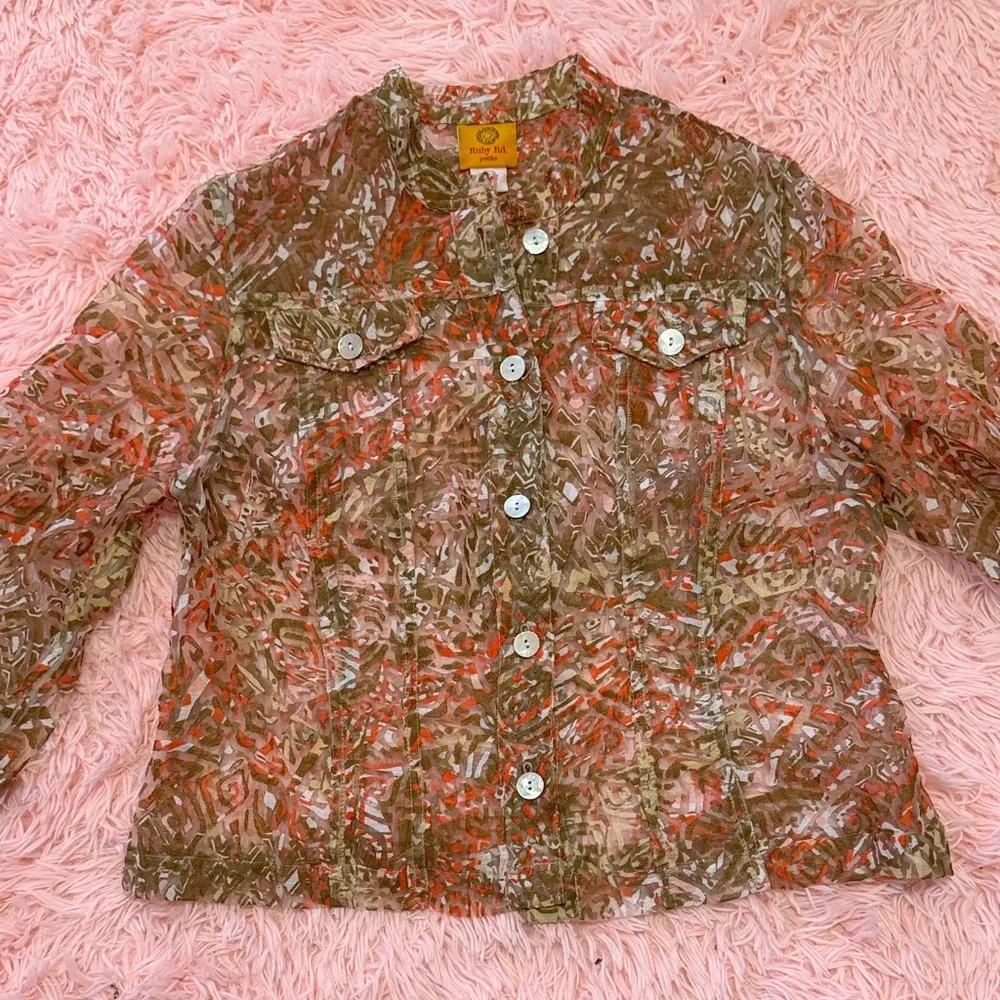 Vibrant jean jacket with a mix of earthy tones. Features button-up front and classic collar. Ideal for casual outings.