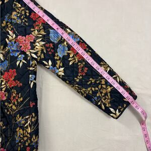 Used, excellent condition. Black collarless jacket with beautiful floral design throughout with pops of red, blue, and yellow. Full zipper closure. Front side pockets. Approximate measurements shown in photos.