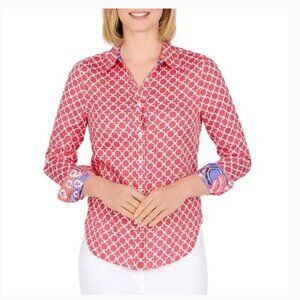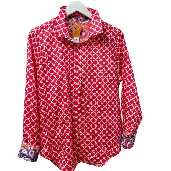 Ruby Rd Womens Shirt Size 10 Red Geo Preppy Print Long Sleeve Button Up