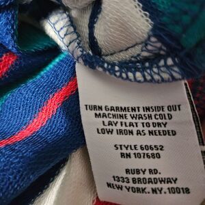 This Ruby Rd. women's top in size 2X sports a vibrant multi-color striped pattern. Made from a polyester blend, it features a tie-top style, 3/4 cinched sleeves, and a pullover stretch fit for ultimate comfort.