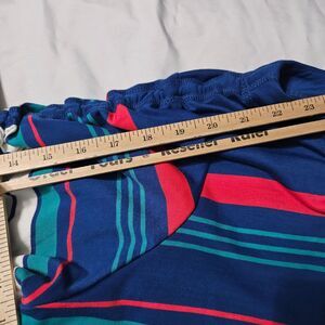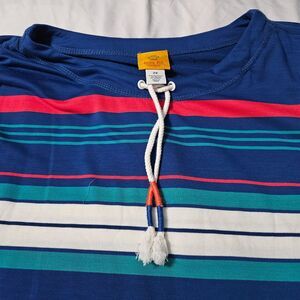 This Ruby Rd. women's top in size 2X sports a vibrant multi-color striped pattern. Made from a polyester blend, it features a tie-top style, 3/4 cinched sleeves, and a pullover stretch fit for ultimate comfort.