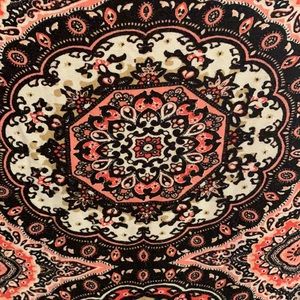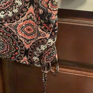 Great condition, Rayon/spandex so very comfortable! Lost weight and it’s too big now. Ties on left side.Black, white and peach, 3/4 sleeves , great for spring, summer as very lightweight.