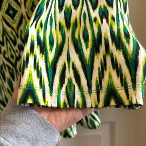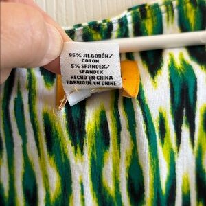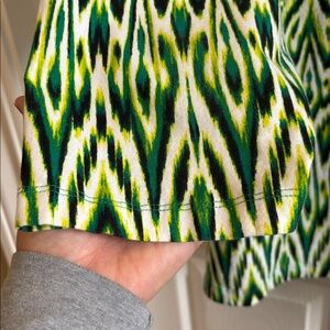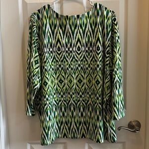 Excellent loved condition. 3/4 length sleeves. White, green, yellow, and black in color. Loosely attached yellow/green, black, and silver embellishments. Could be tacked down a little tighter easily. No signs of wear or discoloration. Cotton/spandex blend. Perfect transition piece for any season. Approximately 26” pit to pit, stretches to approximately 29”. Approximately 26 1/2” from the shoulder in the front and approximately 27” in the back. V-neckline. Pet friendly, smoke free home.