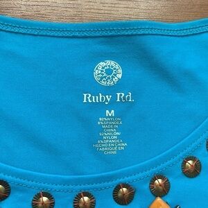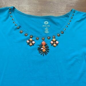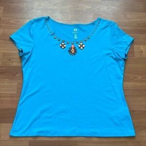 Ruby Rd aqua short sleeve top embellished with earth tone beads and jewels
