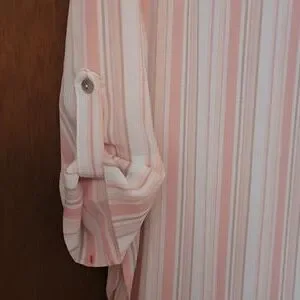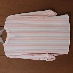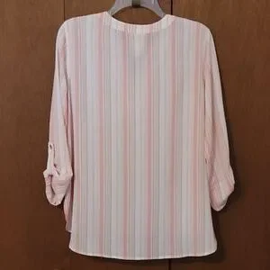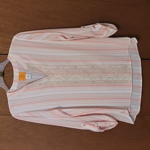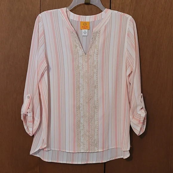Ruby Rd blouse, Size petite M. Pink, white & Tan stripe, rolled sleeves with tab, embroidered front. Like new. Pit to pit 21 inches, 25 inches long. T15