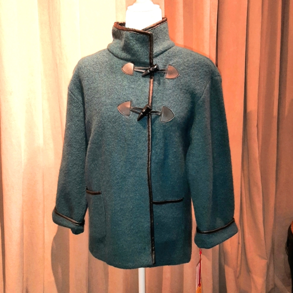 NWT, 100% wool, teal color, approximately 20" pit to pit, approximately 26" shoulder to hem. Observe final photo, trim around collar is peeling.