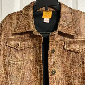 Polyurethane polyester faux leather embossed leather jacket. Soft and broken in. Lightweight no lining. Button cuffs and front. Top front button pockets and button tab sides. Broken in look. Approximate Measurements Laying flat: pit to pit 20” - shoulder to hem 19” - sleeves 18”. Preowned good used condition please check all pictures. (lip10724)