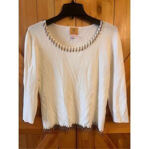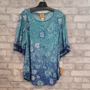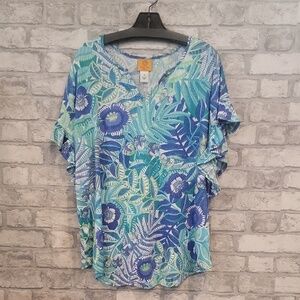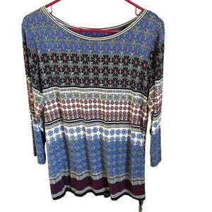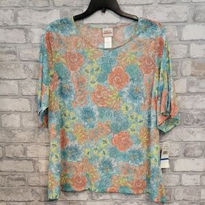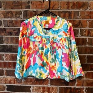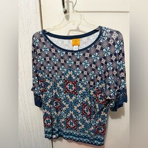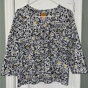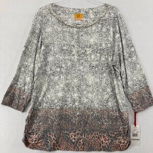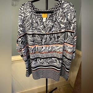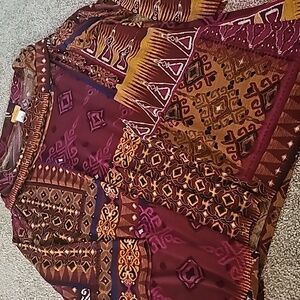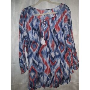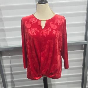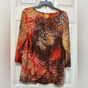 EUC Ruby Rd sheer blouse with animal print red and black. Cuffs roll up and button loop.
