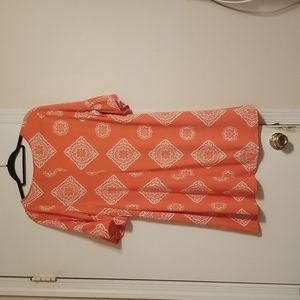 Pretty coral Ruby Rd dress. Slight ruffle on sleeves. Gold bar at neckline. Super cute!