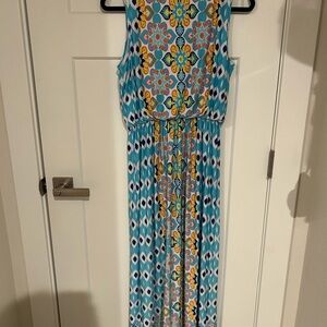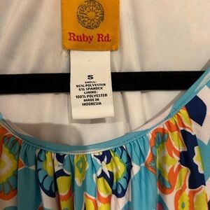 Ruby Rd bright floral dress with sleeveless design. Features blue, orange, and yellow patterns. It has an elastic waist to provide definition. Like new condition.