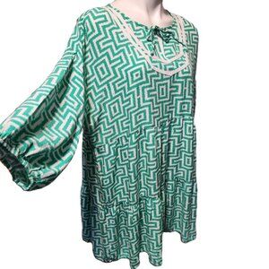 Ruby Rd. dress Women's XL Green white trellis print Split neck 3/4 puff sleeves