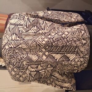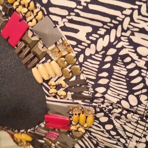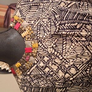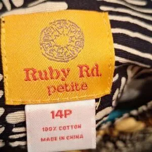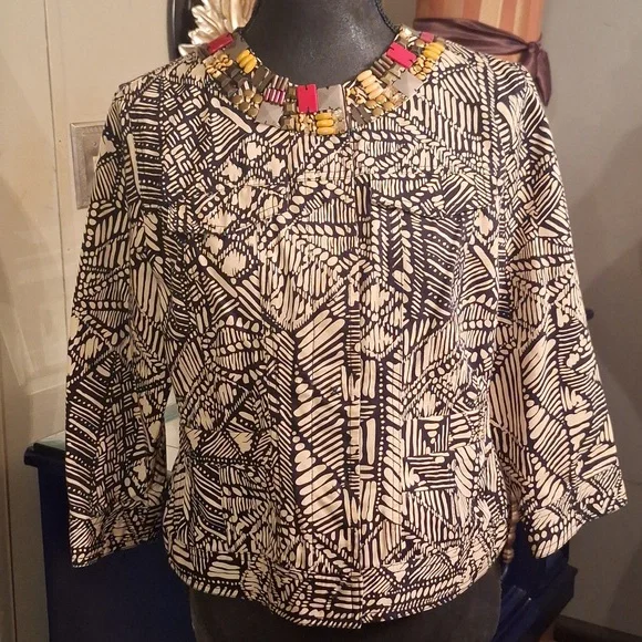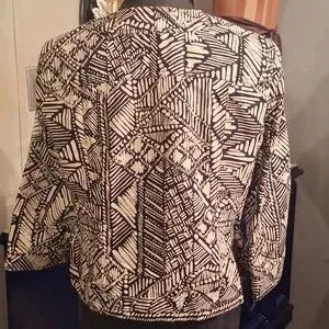 Ruby Rd. geometric pattern jacket with gemstone neckline. Front pockets. 3/4 sleeves. 20" armpit to armpit laying flat.