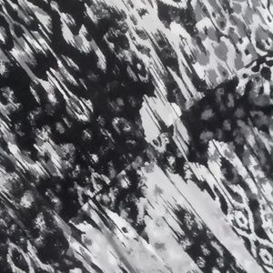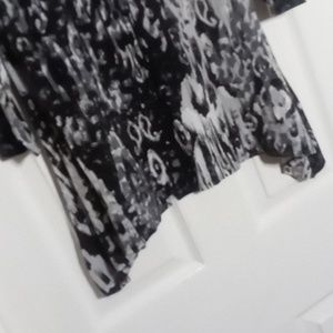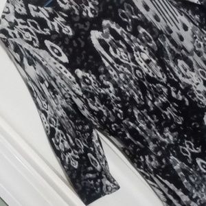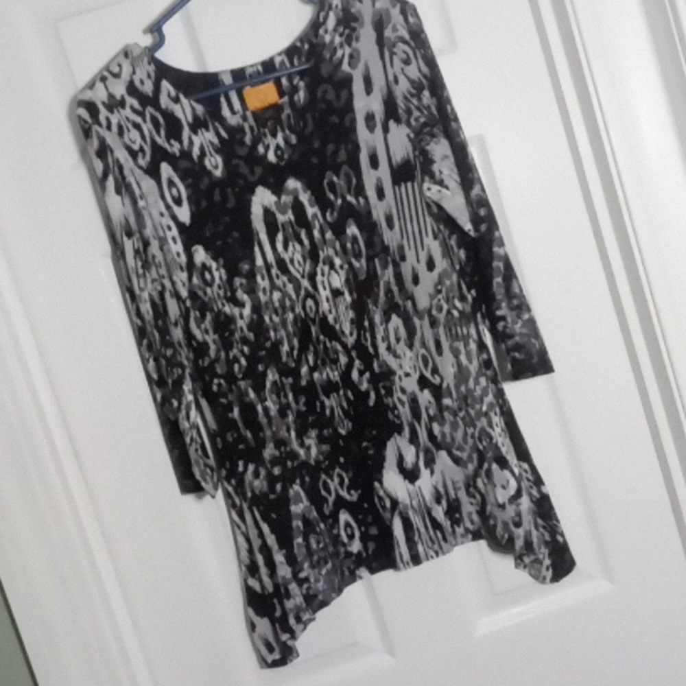 Women's Size Small, black gray and white abstract tie dye print rayon Spandex knit 3/4 length sleeve scoop neck shark bite hem top from Ruby Rd. 27" back length from shoulder, 18" pit to pit and 18" sleeve length from shoulder. snake animal print soft beach boating cruise yachting travel vacation music festival concert hippie