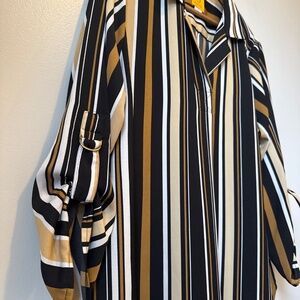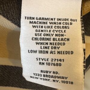 Ruby rd. Size large, hundred percent polyester, three-quarter length sleeve with gold hooks to sent up. Pull over striped blouse, lightweight.