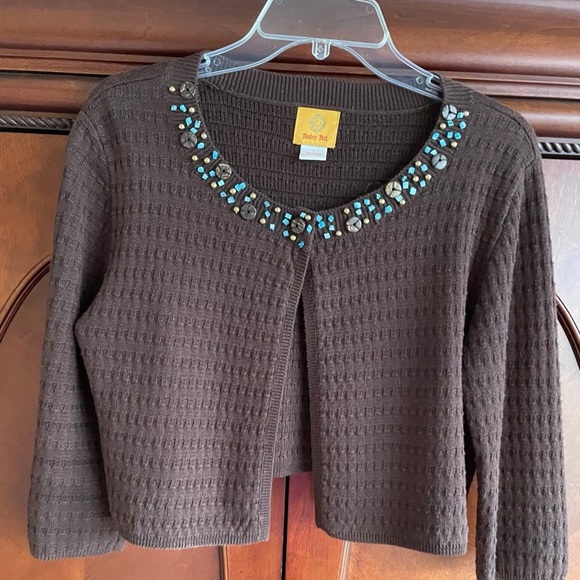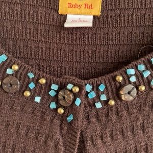 Brown knit with turquoise and gold embellishments, snap at top, excellent condition