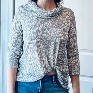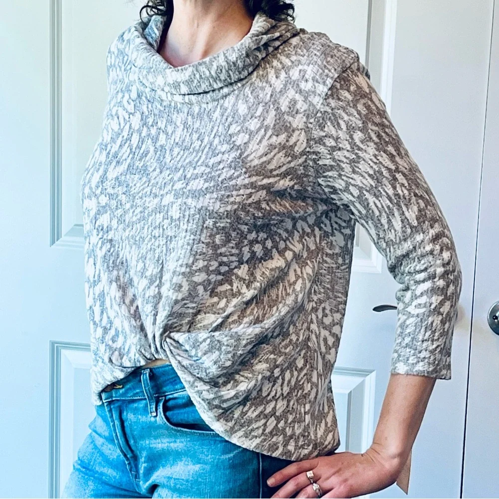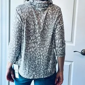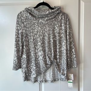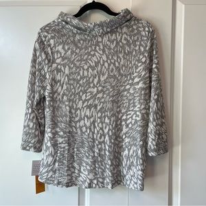 New with tags - cowl neck blouse, very soft feel, short in front, longer in back, grey and cream/white cheetah print