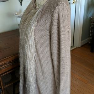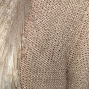 EUC Ruby Rd cardigan sweater with faux fur trim down the front. Taupe with gold threads running thru it giving it a subtle sparkle. Large hook and eye for closure at the neck if desired. Like new - only worn once.