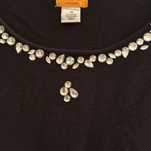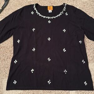 Embellished with plastic gems. 3/4 length sleeves. Soft and comfortable rayon/nylon blend fabric. Light weight. Not too heavy. EUC. Only worn a couple of times for holidays. No stains rips or pulls. See pics for measurements.