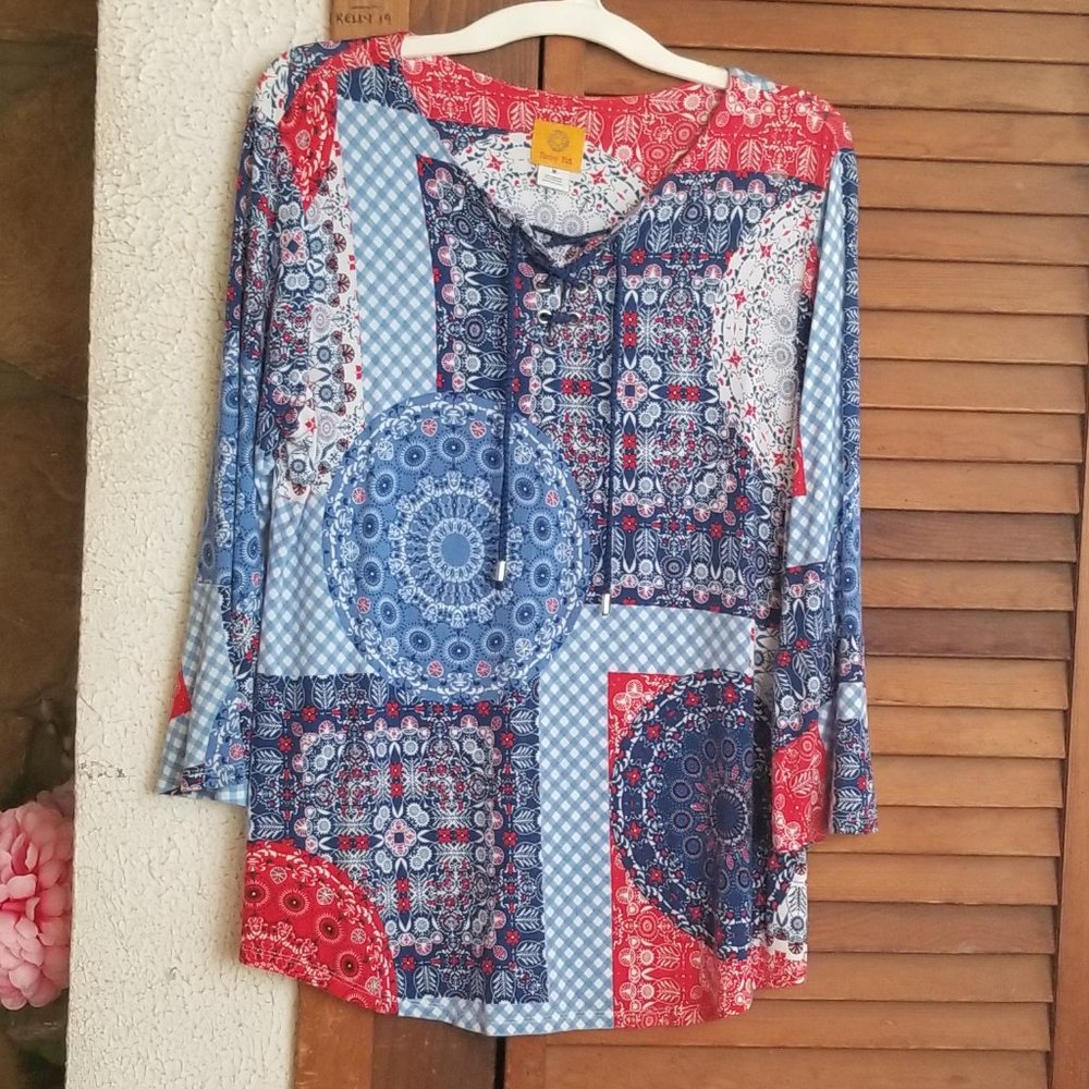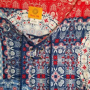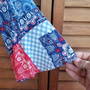 Red, white and blue bandana design with bell shaped cuffs. Lace up detail on the v-neck. Beautiful top in excellent condition.