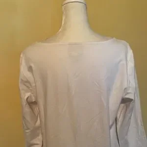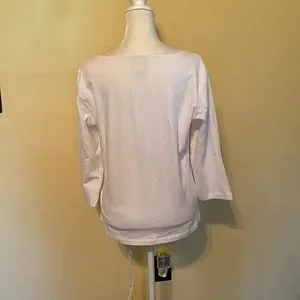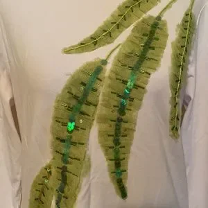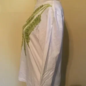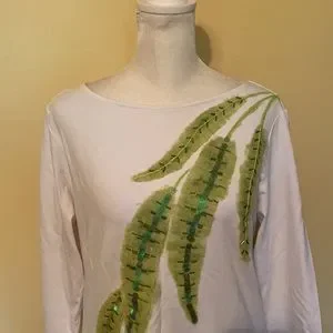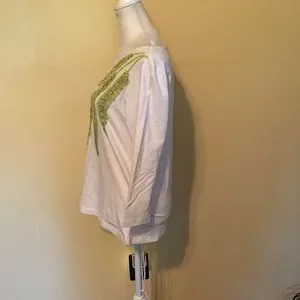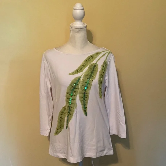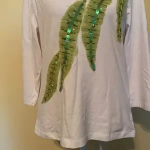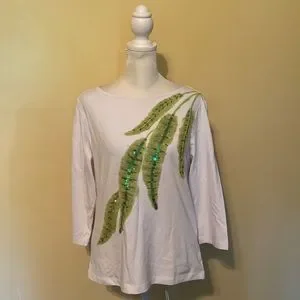 Ladies small Ruby Rd top, white with green leafy design that is both print and sequins/tulle, very soft texture, lightweight cotton/spandex blend