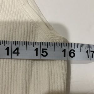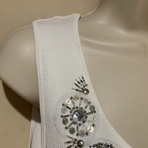 Super embellished neckline. Very stretchy. Measurements in photos. There are a few minor snagged areas where the beaded edges rubbed when the top was folded. Not bad, and still a really pretty top (see last photos)