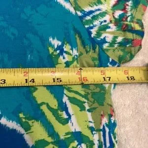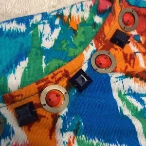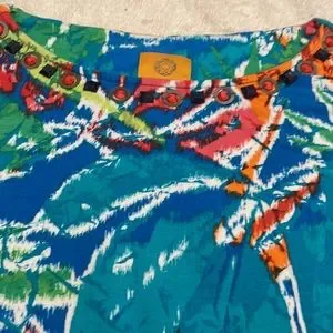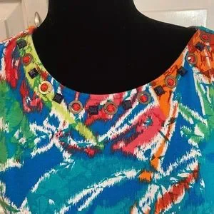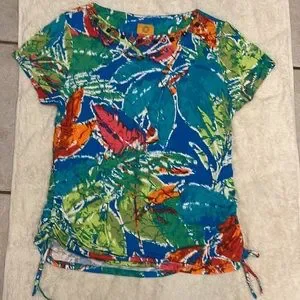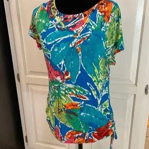 Ruby Rd. Tie dye look crew neck top. This is so colorful and comfy on. Has beads around front neckline and ruched sides with ties. Excellent quality, see measurements in pics.