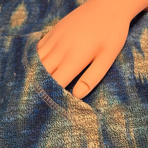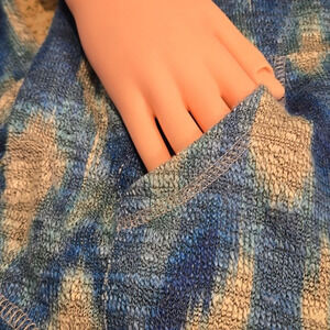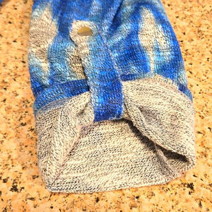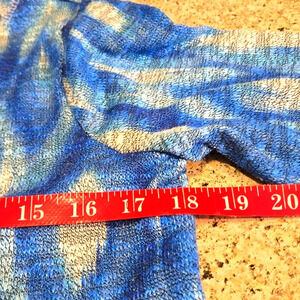 The pattern on this top is reminiscent of an ikat-inspired design. It features a blend of soft blue and white hues, with the design creating an almost tie-dye effect.