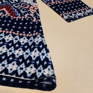 Chic tunic with bold geometric design. Features blue, burgundy,white and pink colors in the print pattern.Ideal for versatile styling.