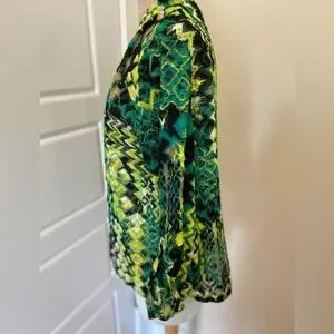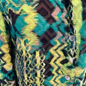 You will be the life of the party in this fun printed blouse.Roll tab sleeves.Split neck,button front.gently used condition.18” across,23” length