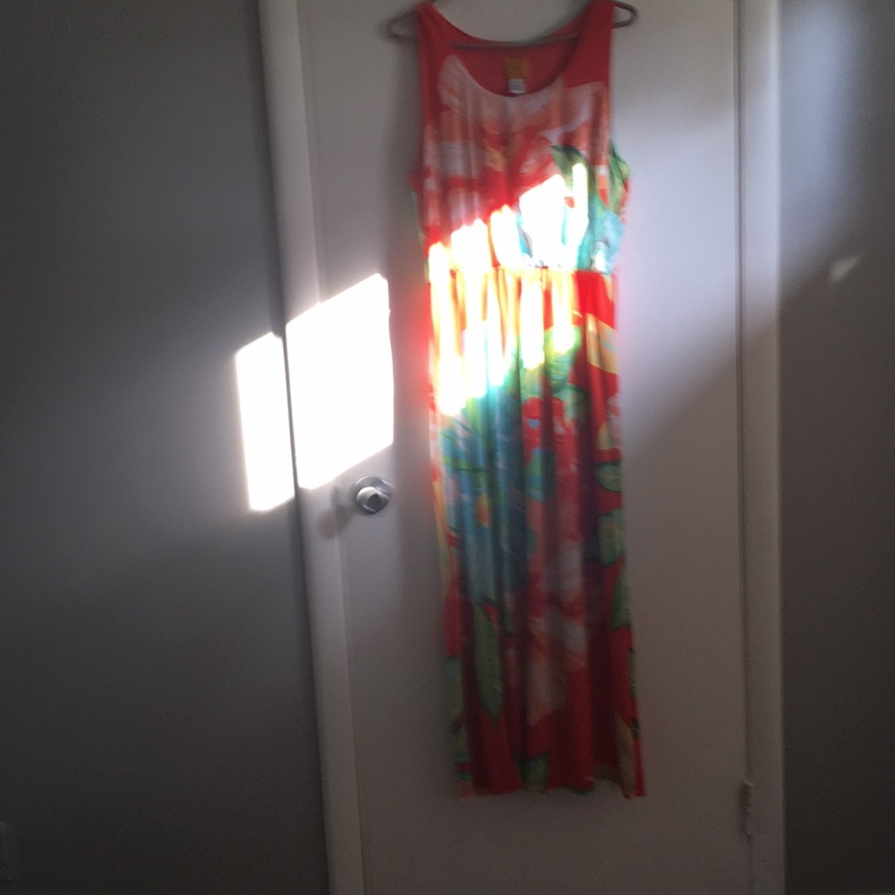 Flowy fun Ruby Rd. Maxi Dress. The turquoise and tangerine colors on this classy dress will show off your end of summer tan!