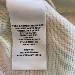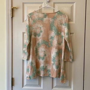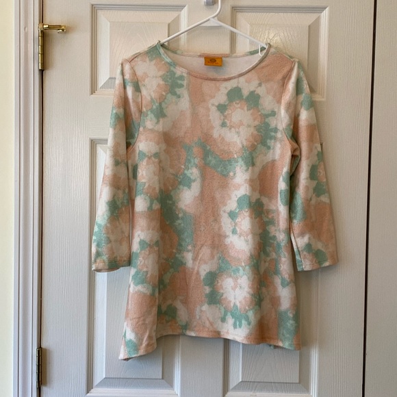 Ruby Rd.top. Very soft and comfortable. Sides are longer at hips. Perfect for leggings. Usual wear and tear. Size cut out. It’s a medium