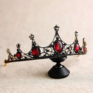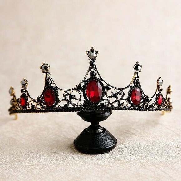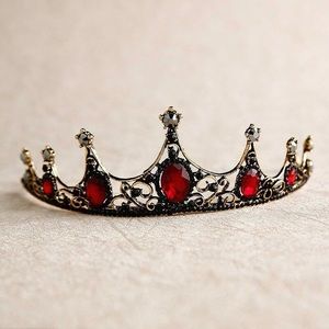 Antique gold crown. Red oval cut rhinestones and black diamond rhinestone.