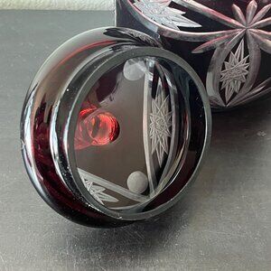 This dark ruby red cut-to-clear glass biscuit jar has an intricate pattern etched into both the base and lid, with a ring of ovals just under the neck. Clear decorative finial. Measures approximately 8" tall. Most likely Bohemian glass, Czech in origin.
