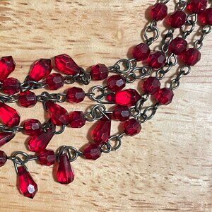 Beautiful ruby red beaded necklace. 4 strands of slightly different lengths. The necklace measures about 8" when closed (at the smallest strand) with a 2.5" extender.