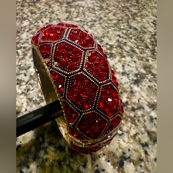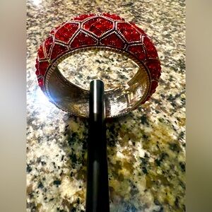 Brand new Ruby Red Rhinestone Bangle, shiny silver designs weave into a bangle around wrist for a finish touch. Features a hinged closure.