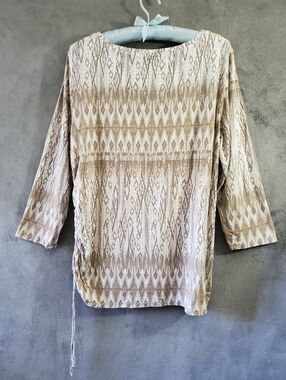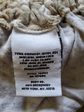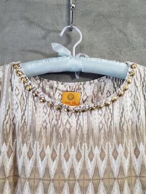 Gold beads decorate the neckline of this versatile top. Pair it with leggings or jeggings for lounging, skinny jeans and a pair of heels for a night out, dress slacks for a day at the office, or a skirt for a formal affair. Fabric is lightweight and stretches.