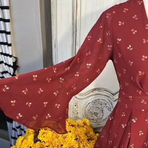 This stunning red romper is designed for cocktail nights, featuring a flattering fit and flare silhouette. The ruffled wrap style and 3/4 bell sleeves add a touch of elegance, while the plunging neckline enhances its sophisticated appeal.