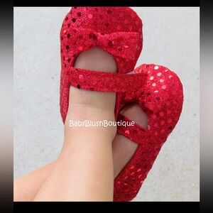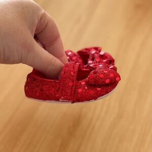 Sparkley red baby shoes with sequins & bow embellishment. Purchased on Etsy. Handmade & worn once with my baby girl’s Dorothy costume. See additional bow headband listing. (Romper still available for purchase on Etsy at Lily & Max Co…not included with this sale as it is embroided with my daughter’s name)