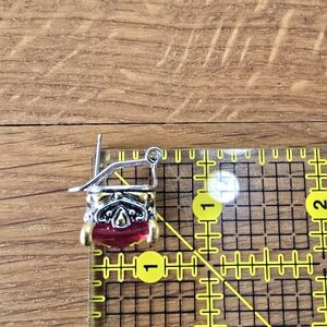 Ruby Rhinestone Pendant and Earring Set. Condition is excellent! unmarked. The setting is silver and gold colored with red rhinestone. The pendant back is clasp like and opens. The earrings are posts with a clasp.