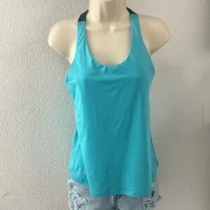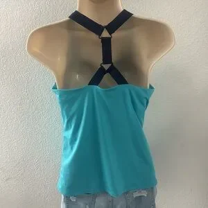 Athletic top with shelf bra and place to put nipple cover inserts. Size 34B-34F. Turquoise tank, racer back
