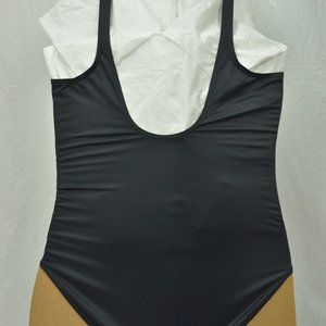 The slimming Aruba one-piece swimsuit by Ruby Ribbon features invisishape technology to support and smooth you without underwires. The fabric has UPF 50 protection and is chlorine resistant. This wide strap deep v-neck suit has front diagonal ruching for optical slimming. Scoop back. It has a generous no-ride-up bottom. Security strip is intact. Size 12, color black. Corresponds approximately to a band size 38