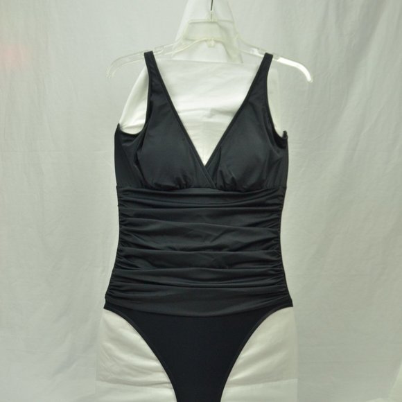 The Fiji swimsuit is a one pice suit with a deep V neckline, straight, high back, slim, adjustable straps, with front, figure-slimming rushing and generous bottom coverage. All Ruby Ribbon swimsuits have invisishape technology to slim and support you without underwires. The fabric gives UPF 50 protection and is chlorine resistant. This suit is new with security strip intact. Size 10, Black. Corresponds to approximately a cup size of 36.