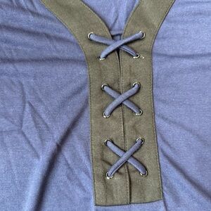 Active inspired with contrast color banding and lace up detail. 3/4 length sleeve with slit cuff detail.