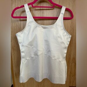 Trade in your bra for Ruby Ribbon comfort and support with a full support Original style, scoop neck cami. Featuring cups that stretch to accommodate B to G cups easily. The body of the camisole features double fabric in cups and in areas that need extra support. The bottom inside edge has medical grade silicone gripper to keep the cami from shifting up. The strap is ADJUSTABLE, it has a padded feel. The color is white. Size 42