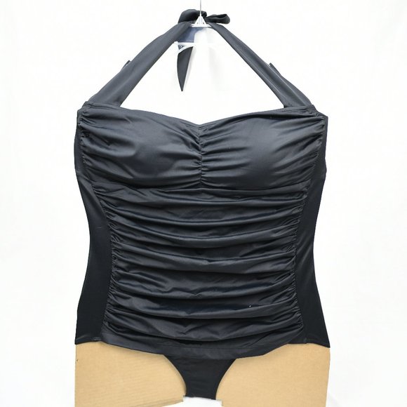 The Riviera swimsuit is a one pice suit with a sweetheart neckline, straight, high back, Halter strap, with front, figure-slimming rushing and generous bottom coverage. All Ruby Ribbon swimsuits have invisishape technology to slim and support you without underwires. The fabric gives UPF 50 protection and is chlorine resistant. This suit is new with security strip intact. Size 12 Black. Corresponds to approximately a cup size of 38