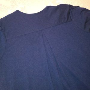 Do you ever get tired of wearing black? Navy is such a pretty alternative! This soft knit top has a V neck, a feminine tulip split sleeve, and a cute pleat at the yoke in the back. The front hem is rounded at the sides with a split between the back square hem. Looks great with leggings, jeans, or shorts.