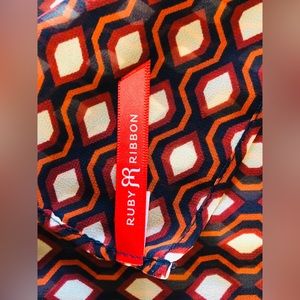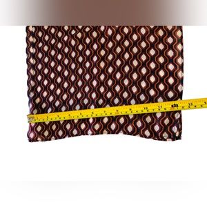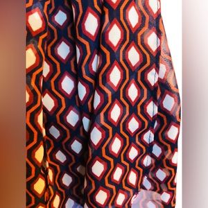 This scarf is Navy and orange in color. Measures 66” long and 12 1/2” wide. Made of 100% polyester.