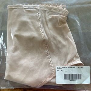 Waist high brief with sheer panels and back, center back seam gathered for gentle support. Leg rear edges are single fabric silicone gripper for no visible panty lines. Front panel reinforced with extra layers for smoothing tummy support. Picot edging on upper waistband edge. This elegant panty should be sized up if in doubt, to extend the life of the sheer fabric. Coordinates with sheer cami and demi. Pale color, xl size.