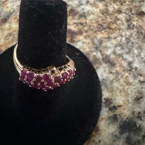 This 14k gold ruby ring is lovely on. I’ve worn it very little. There are 19 stones in the setting with one missing on a corner.. (You can hardly see the missing stone.)