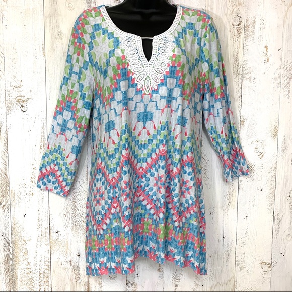 Ruby Road Multicolored Aztec Print Lace Keyhole Top
